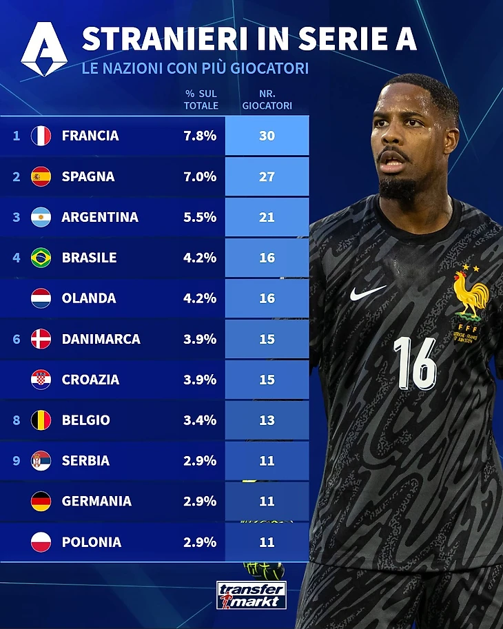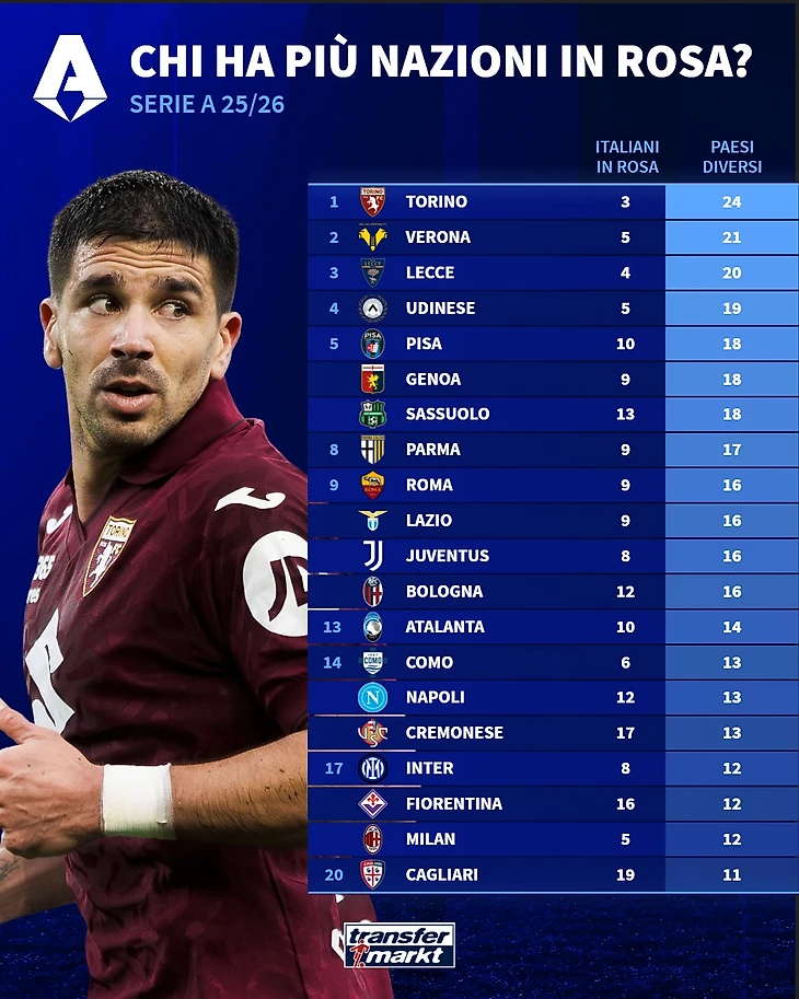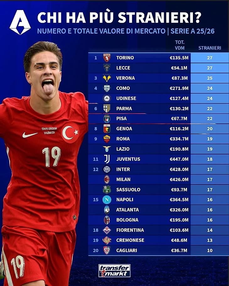 Проблема очевидна и заметна, если взглянуть на составы клубов Серии А. Transfermarkt проанализировал их и показал на инфографиках большое количество легионеров.