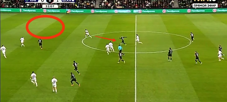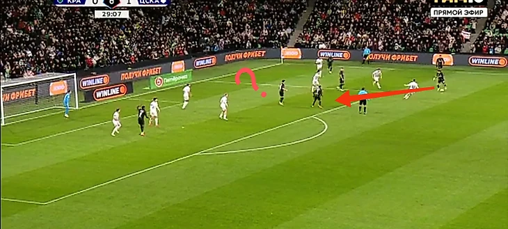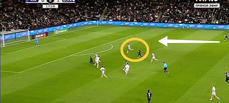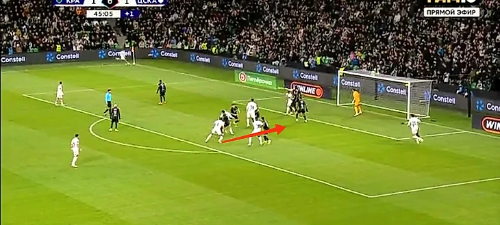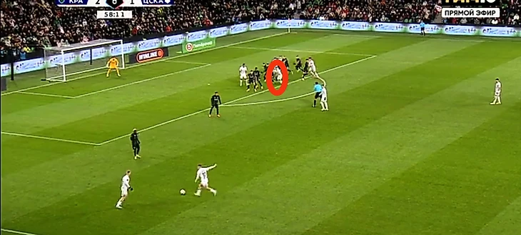 ЦСКА же (а если быть точнее, конкретно Жоао Виктор) воспользовался более попсовым, но не менее эффективным приëмом – выбеганием из глубины. Вот Виктор стартует из-за пределов штрафной, из-за чего остаётся незамеченным: