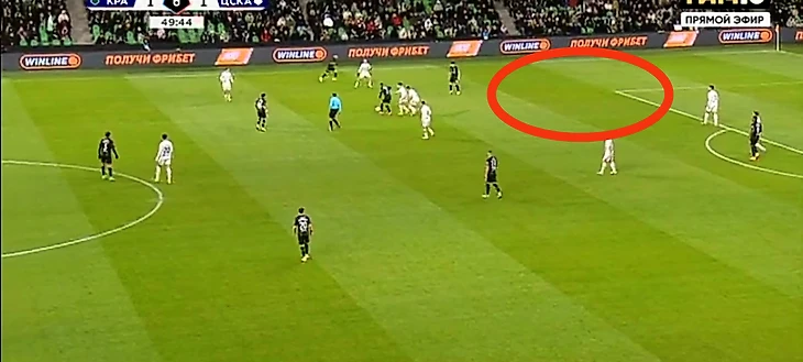 Вроде бы тут тоже ничего сложного: просто опустить Облякова в линию и сесть поплотнее в привычные по сезону 4-4-2, которые несколько месяцев назад сдержали «Краснодар» без особых проблем. Но на деле даже здесь ромб не мог нормально переформатироваться. Дальше просто накидаю вам пару скринов без объяснения происходящего на них – структура ЦСКА опишет его лучше любых слов.