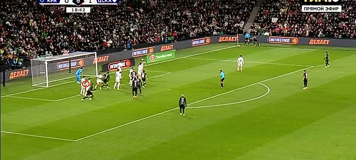Переходим к 18-ой минуте и прекрасной адаптации к ЦСКА в исполнении тренера по стандартам Виталия Корнеева. Два разыгранных по одной задумке угловых подряд завершились опасными ударами.