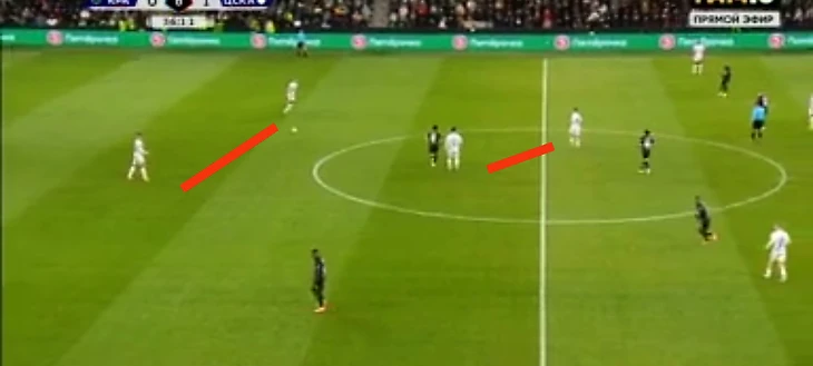 Мало неразберихи от ромба, так вот вам бонус – персональная опека вингеров крайними защитниками. Лучший пример – момент перед победным угловым. Вот, наконец, что-то адекватное структурно. Да, с пространством между линий, да, с огромным коридором между цз, но по меркам данного матча не так плохо. Но вот в это пространство между линий поднимается Са.
