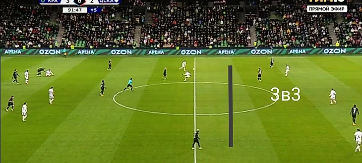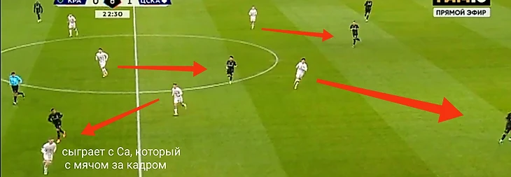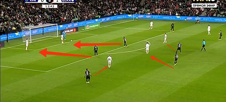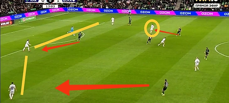 В таких условиях часто приходилось наоборот перегружать билд-ап. Радикальнее всего при ударах от ворот, где гости выстраивались в 3-4-3. «Краснодар» прессингует персонально, но это всё-таки не «ПСЖ», «Бавария» или «Рома», так что стабильно сохранять 1в1 осмеливались не всегда. Здесь «армейцам» дышалось получше, но что после розыгрыша делать всего лишь трём игрокам впереди – непонятно.