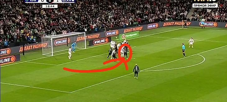 Перед голевым угловым футболисты ЦСКА столпились в районе 11-метровой отметки. На это соперник попытался заблокировать всех четверых (соотношение игроков было 4 к 4) блоком в виде живой стены.