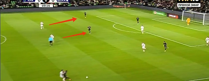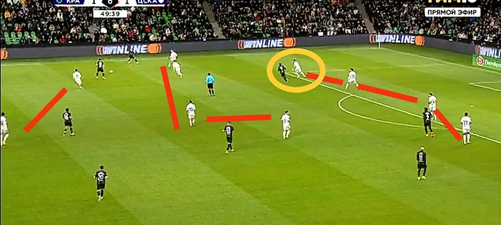 Челистини не захотел усиливать билд-ап под отлично прессингующий «Краснодар», а попытался сохранить привычный минимализм с традиционными для «армейцев» 3+1, которые иногда превращались в 2+2 или даже 2+1. Естественно, получили за это <5 PPDA от «чëрно-зелёных» (напоминаю, что меньше=лучше) и смешные 73% точности передач, ведь с таким билд-апом из-под таких персоналок можно выйти только через длинную передачу, но своего Кордобы, Соболева или хотя бы Луиса Энрике у ЦСКА нет.