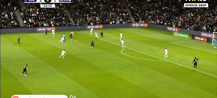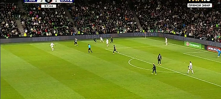 Что-то подобное мы видели и в обратную сторону. ЦСКА всеми силами наваливается вперёд, но проигрывает борьбу и получает 3 в 3 на свои ворота. Из этой атаки «быки» получают опаснейший момент, но Перрен немного не попал в створ.