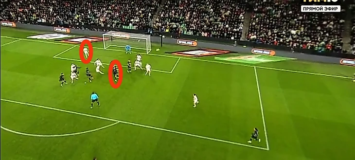 «Армейцы» легко избавились от этого блока – вместо забега на ближнюю по прямой сначала пошли на мяч, и лишь потом к воротам. При этом «быки» как стадные животные побежали за ними на ближнюю штангу в полном составе, даже не обратив внимание, что Мойзес вместо ближней пошёл на дальнюю. Ближайшим к нему игроком был Черников, но винить его в этой ситуации я бы не стал – задачей, по видимому, был блок, а не персональная опека.