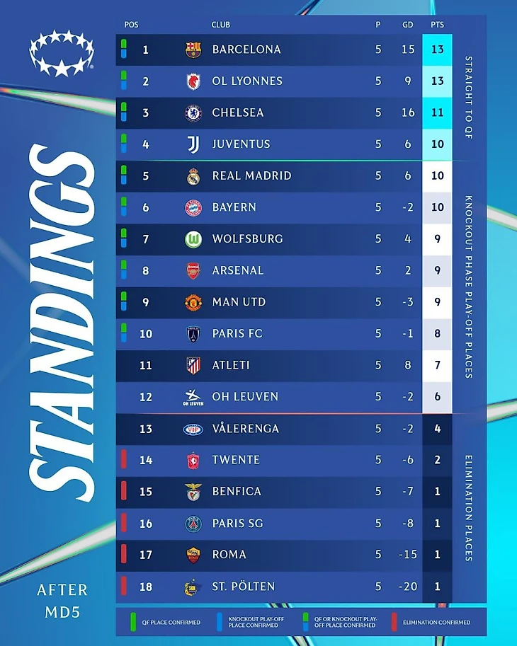 Восьмикратные победительницы ЛЧ не отстают от «Барсы» – у лидеров общего этапа по 13 очков.