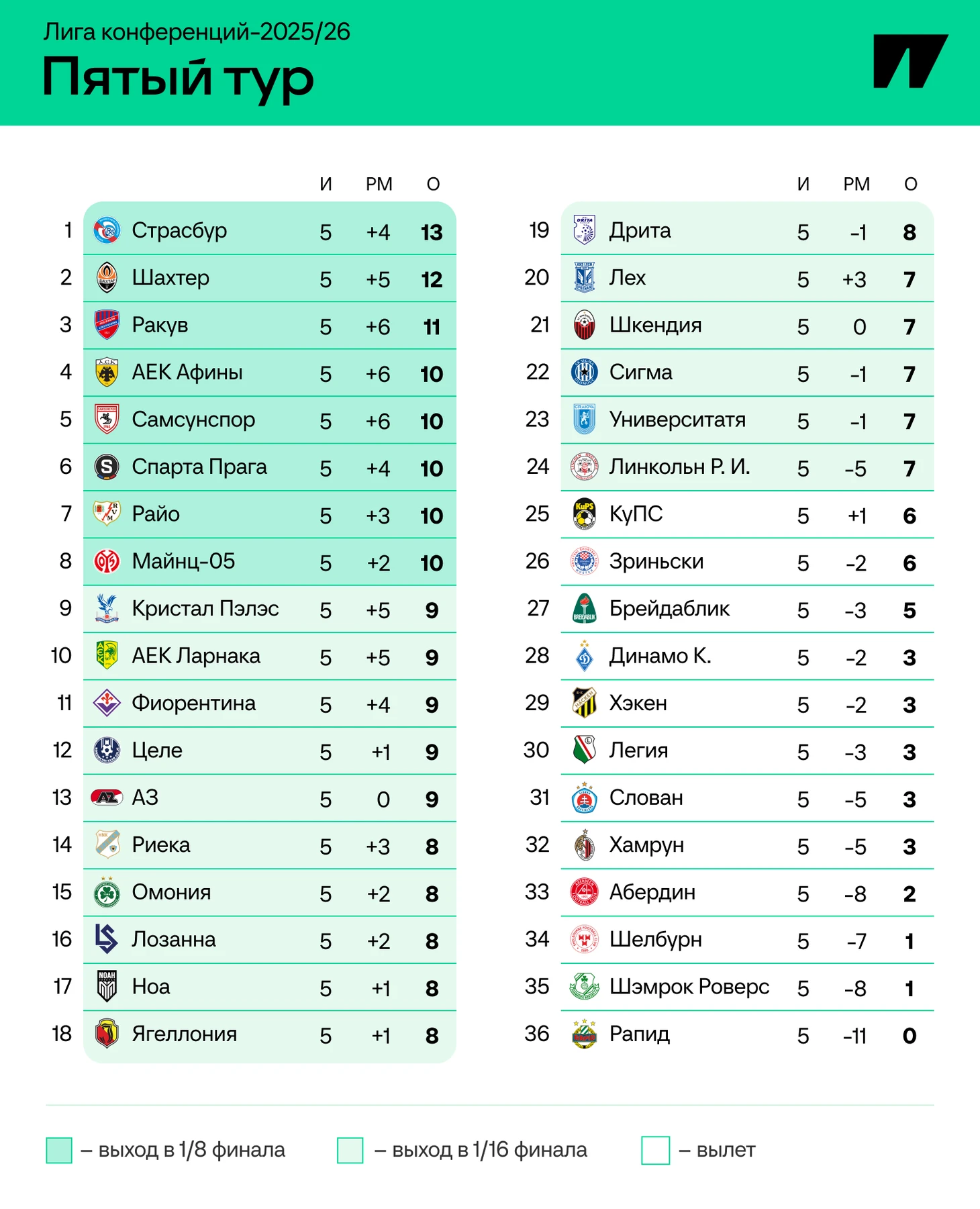 Последний тур состоится еще в этом году – в следующий четверг, 18 декабря. Главные матчи: «Майнц» – «Самсунспор», «Кристал Пэлас» – КуПС, «Лозанна» – «Фиорентина», «Страсбур» – «Брейдаблик» и «Райо Вальекано» – «Дрита».