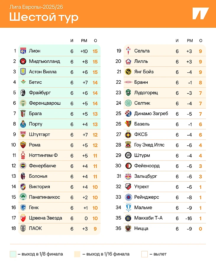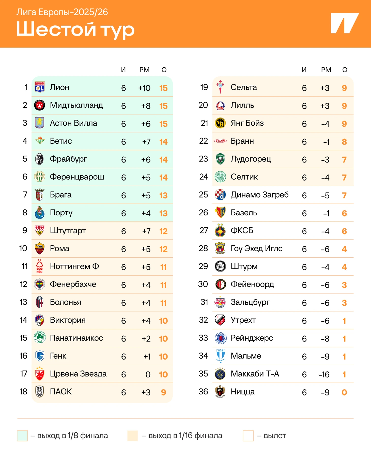 Два заключительных тура пройдут 22-го и 29 января. В седьмом выделяются две вывески: «Фенербахче» – «Астон Вилла» и «Рома» – «Штутгарт», также интересны игры ПАОК – «Бетис», «Сельта» – «Лилль», «Брага» – «Ноттингем Форест» и «Болонья» – «Селтик». А «Лион» сыграет в гостях против «Янг Бойз».