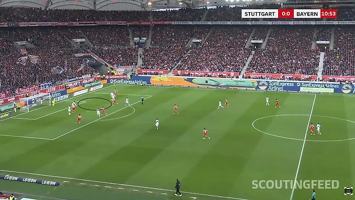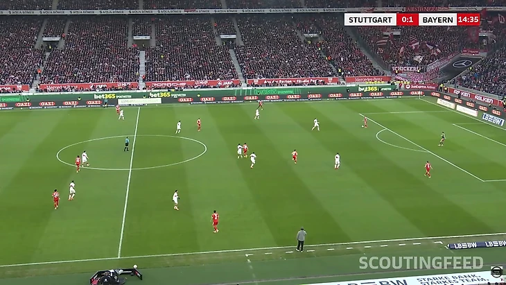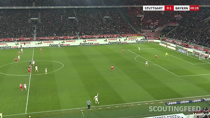 Во втором тайме была ситуация, когда розыгрыш немного изменился и «Бавария» подстроилась, за счет того, что Олисе поджимал центрального защитника и закрывал зону на случай возможного успешного выхода, дабы не дать разогнаться, но в подобном сценарии свободным оставался Миттельштадт.