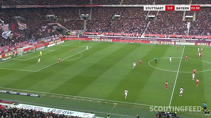 «Штутгарту» было чем ответить. Уже становится трендом розыгрыш от вратаря, в котором рядом с голкипером остаются два центральных защитника и рядом с ними, соответственно, остаются их два непосредственных оппонента. В подобном соотношении разыгрывающая команда имеет преимущество 3+2 в первой стадии и может пользоваться большинством, которое приобретается за счет вратаря.