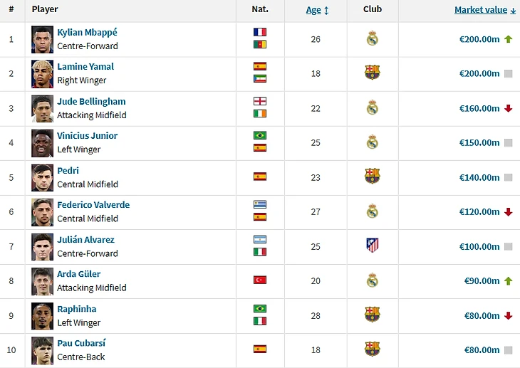 🤑 Transfermarkt обновил стоимость игроков Ла Лиги. Ямаль и Мбаппе – самые дорогие, Беллингем и Рафинья упали в цене