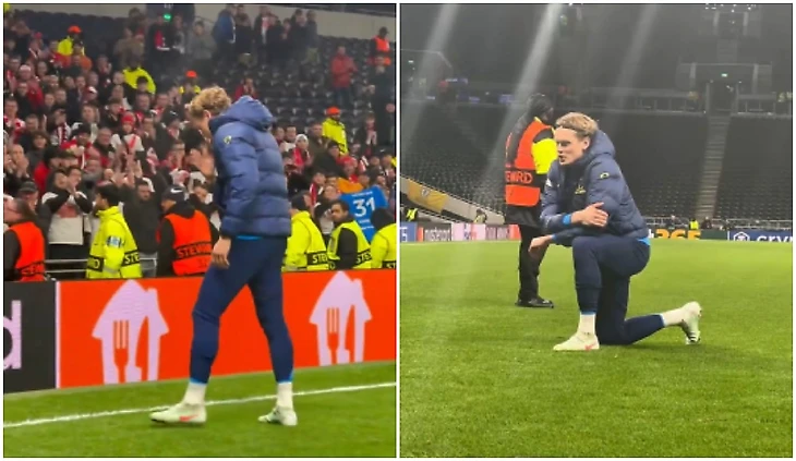 Вратарь «Тоттенхэма» Кински встал на колено перед гостевым сектором «Славии». В прошлом он играл за клуб