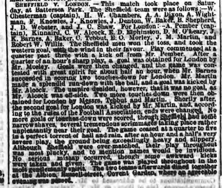 Итог матча: Лондон 2:0 «Шеффилд» (плюс 4 тачдауна против 0). После игры шеффилдцы жаловались, что соперники слишком активно пользовались руками и «кулаки часто находили носы», как позже вспоминал Честерман. Однако правила это позволяли, конфликтов не возникло, и команды дружно отправились ужинать в таверну The Albion, запивая впечатления увеселительными напитками.