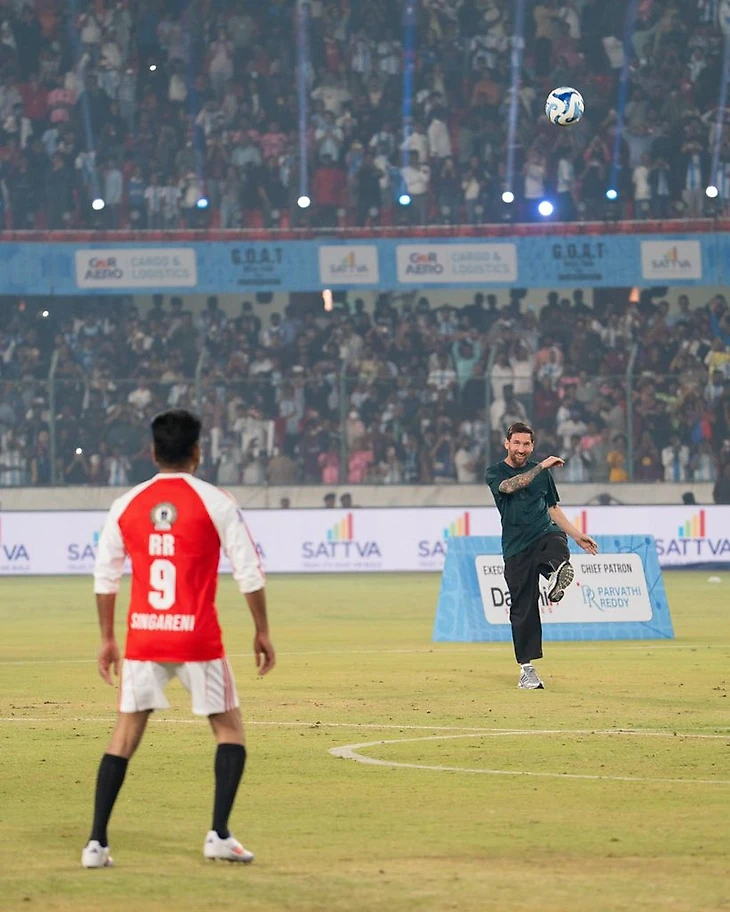 По соцсетям разлетелся ролик, в которым с Лионелем пытается попинать мяч индиец, но у мужчины не получается сделать ни одной точной передачи. Как оказалось, с Месси играл Ревант Редди – главный министр Теланганы.