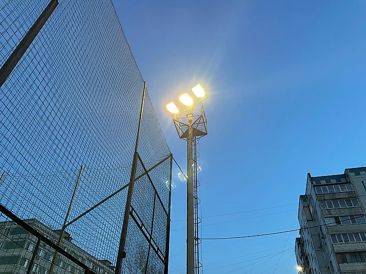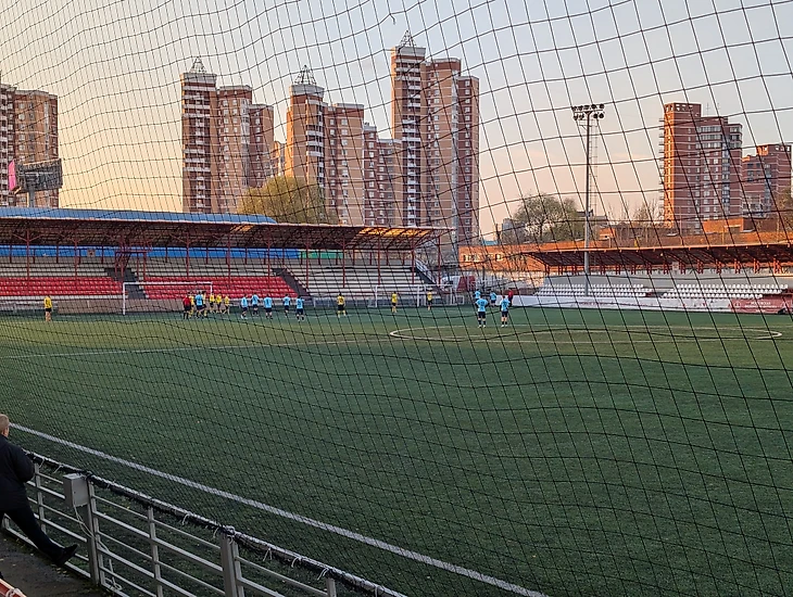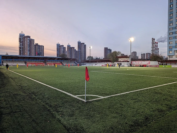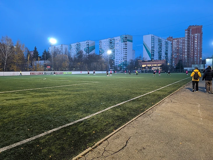 Паркуем машину и двигаем на стад. Впереди ещё четыре матча. Начнём со стадиона «Новые Химки», где уже идёт игра Чемпионата Московской области Ю-18 между СШОР «Химки» и СШ «Орион» (Балашиха).