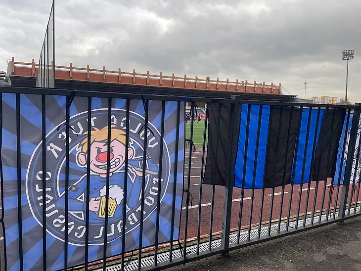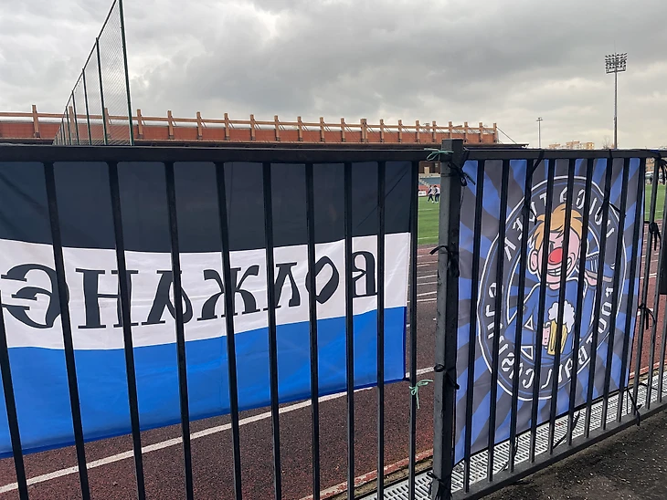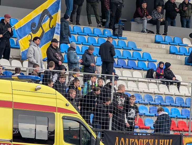 Подъезжаем к стадиону «Салют». Решили взять билеты на гостевой сектор. Около касс был виден хозяйский активный сектор.
