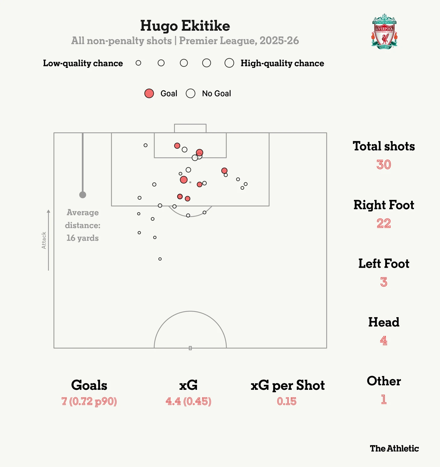 Экитике продемонстрировал невероятную серию, забив семь голов в чемпионате при коэффициенте xG (ожидаемые голы) 4,4, а коэффициент реализации ударов составил 23%. Среди игроков высшего уровня, которые в этом сезоне отыграли не менее 500 минут игрового времени, только Эрлинг Холанд из «Манчестер Сити» может похвастаться лучшим показателем коэффициента забитых голов без учета пенальти за 90 минут — 0,72.