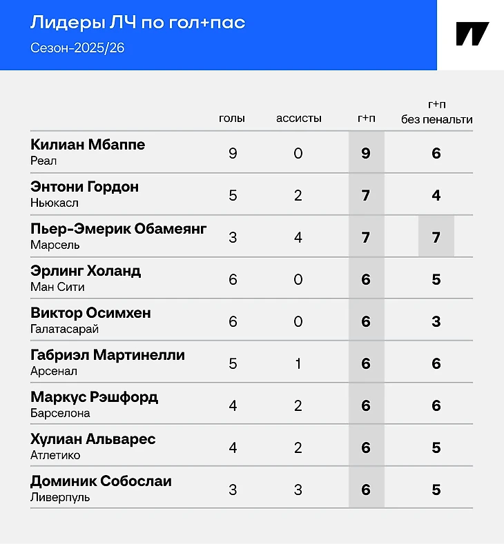 Лига 1 недостаточно крута? Что ж, в Лиге чемпионов Обамеянг вообще лидирует по гол+пас без учета пенальти, с 11-метровыми его обгоняет только Килиан Мбаппе.