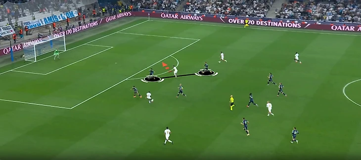 Вот показательный эпизод из матча с «Аяксом». Вместо того, чтобы прямолинейно бежать к воротам, Обамеянг видит пространство в стороне, притормаживает, чтобы избавиться от опеки, ставит корпус бегущему на подстраховку сопернику, и уходит в сторону для голевого удара. Советую посмотреть в динамике.