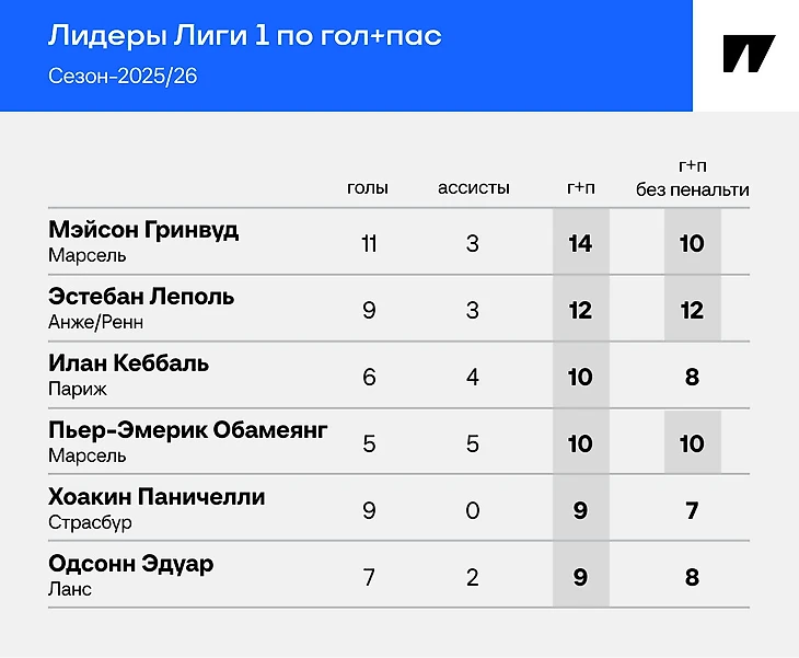 Только один игрок Лиги 1 после 16 туров набрал больше очков по гол+пас без учета пенальти, чем Пьер-Эмерик Обамеянг.