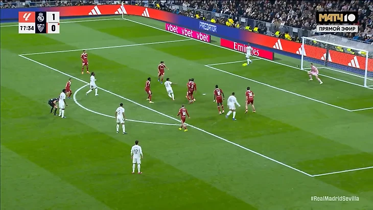 Во-первых, при розыгрышах Винисиус и Родриго располагались не широко, а узко, заставляя крайних защитников гостей идти за ними в центр и освобождать пространство за спиной. Ход не сработал эффективно из-за слишком пассивного движения атаки «Мадрида» – очень мало рывков и перемещений, «Севилья» не получала большой нагрузки.