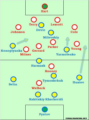 Наибольший интерес вызвала дуэль Олега Гусева и Эшли Янга. Правый защитник украинцев играл очень высоко, тем самым выдавливая оппонента к его воротам. Сперва Янг был очень удивлён столь смелым намерениям Гусева (чего не должно было быть, если основываться на двух предыдущих матчах Украины), и Эшли Коул свалился слишком близко к боковой линии, оставляя много пространства между собой и Лескоттом. Когда Янг разобрался в ситуации стал действовать глубже, Гусев, однако, завязал с подключениями вперёд. Поздней Блохин попытался дать Олегу больше места для манёвра посредством его перевода на позицию правого хавбека.