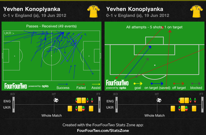 На противоположном фланге Евгений Коноплянка изначально занимал такую позицию, которая придавала атаке ширины, затем резко смещался в центр и наносил удар издали. Одним из них он проверил Джо Харта, который немного неуклюже, но справился с мячом, а четырех других удара оказались неточными. Англия наверняка была рада такой тактики поведения вингеров соперника. Для неё было гораздо выгодней сдерживать их смещения в центр, нежели вылавливать подачи с фланга. Однако и в этой зоне англичанам стоит быть более осторожными, памятуя о том, что именно оттуда пришёл гол от Франции.