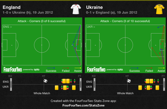 Обе команды сделали немалый расчёт на «стандарты». Англия в основном опиралась на них в первой половине, выполняя подачи из района углового флажка (Джеррард, между прочим, оформил свой третий ассист с правого фланга - возможно, это отчасти объясняет его притяжение к правой стороне), но затем ей пришлось самой сдерживать Украину во время розыгрыша корнеров.