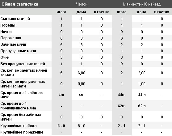 Соперники провели между собой 164 встречи во всех турнирах. На счету «Челси» 44 победы, «Юнайтед» одержал 72 победы, и 48 игр завершились вничью.