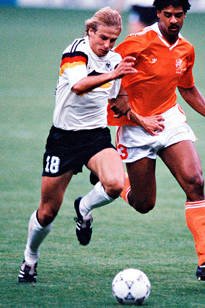 Юрген Клинсманн. Самый яркий из форвардов той команды успел еще и стать чемпионом Европы, в 1995-96 гг. был близок к получению Золотого мяча. Сменил немало команд и чемпионатов и везде был не только важным, но и любимым и уважаемым футболистом. После завершения карьеры переселился в США, откуда был вызван на роль спасителя нации в 2004. Возглавив Бундестим, резко момлодил ее состав и объявил о начале эры атакующего футбола. Нещадно критикуемый за игнорирование обороны, безбашенную игру, ротацию вратарей и за то, что так и не вернулся в Германию на постоянной основе, Клинсманн добился относительного успеха на домашнем Чемпионате мира, заняв третье место, но при этом сделал главное - вернул сборной любовь болельщиков и объединил вокруг нее всю нацию. Заявив после мирового первенства, что он не чувствует в себе больше сил продолжать работу, он передал команду своему ассистенту Йоахиму Леву и вернулся к семье на теплые калифорнийские берега. Спустя два года о нем как о реформаторе вспомнила запутавшаяся сама в себе "Бавария". Клинсманн действительно освежил команду, однако был разгромлен "Барселоной" в четвертьфинале Лиги чемпионов. На фоне разногласий с руководством и не самого лучшего контакта с футболистами этого оказалось достаточно для увольнения. Отдохнув еще пару лет, Юрген нашел устраивающий его вариант работы "без отрыва от отдыха", возглавив сборную США. За год его работы команда одержала две громкие победы над Италией и заклятым врагом - Мексикой, но реальные итоги можно будет подвести после участия в ближайшем международном турнире. Для тех, кто может серьезно обеспокоиться по поводу будущего трудоустройства Клинсманна, добавлю, что он является профессиональным (и потомственным) булочником.