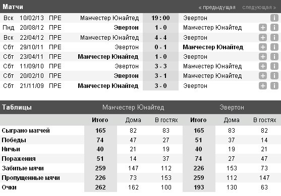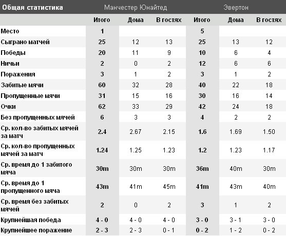 Соперники провели 185 матчей во всех турнирах. «Манчестер Юнайтед» выиграл 80 матчей, на счету «Эвертона» 63 победы, и 42 встречи завершились вничью.