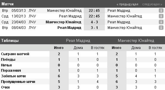 Очень и очень жаль, что последний раз команды встречались так давно. Это Лига Чемпионов 2002/2003, стадия ¼ финала. К сожалению, верх в том противостоянии одержал «Королевский» клуб, но битва была невероятная. Проиграв первый матч со счётом 3:1 в гостях, «Юнайтед» сумел выиграть на «Олд Траффорд» 4:3 чего, конечно же, оказалось мало. Бекхэм, Роналдо, Ван Нистелрой – одни из тех, кто отличились в той двухматчевой драме. Рекомендуется к просмотру перед сегодняшним поединком, дабы зарядиться нужной атмосферой.
