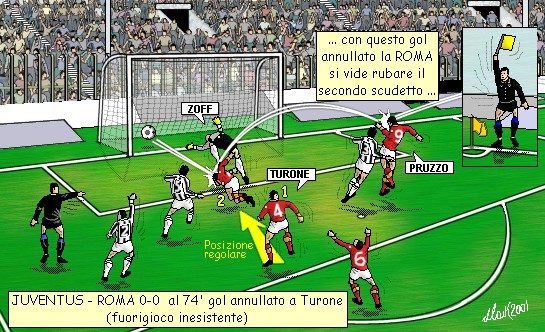 Отношения между югом Италии и её севером, в том числе и в футболе, всегда были горячие. Но, с другой стороны, ультрас-культура, идеология и культура боления начали складываться в Италии довольно поздно- в 60-х годах. А Рома с юхрентусом исторически решали и решают довольно разные задачи. До поры до времени не было момента, который испортил бы отношения, посеял бы вражду между клубами. Делить нам было особо нечего, не было особых точек пересечения. Таким моментом мог стать разве что первый переход в 1969-м капелло из Римского стана в блювентийский, но он даже и близко не привёл к той вражде, к которой в аналогичном случае привёл, переход ебаджо от фиалок к блювотным. В какой-то момент ультрас Ромы и юмердуса (точнее, отдельные группировки- римская Fedayn и туринская Fighters) даже были близки к тому, чтобы стать друзьями. Но вот, настали восьмидесятые, Рома оказалась в руках великого Дино Виолы и это был звёздный час Джаллоросси. В сезоне 1980-1981 Рома не просто боролась за чемпионство, а лидировала на протяжении всего сезона. Лишь после домашней очечки с Фиорентиной (1-1) в 25-м туре Римляне пропустили блювентус вперёд. Момент истины должен был наступить в 28-м туре (в Серии А играло тогда 16 команд и чемпионат состоял из 30-ти туров), в очной встрече лидеровавших блювотников и отстававших на 1 очко Романистов. Игра получилась типично итальянской- оборонительный, закрытый, прагматичный футбол. Неудивительно, что гол был забит всего один, да и то под конец матча, да и то в результате контратаки- отличился защитник Ромы Туроне. По такой, шедшей до гола игре, матч можно было тут же заканчивать. Победа Ромы в матче и в чемпионате? Как бы не так! Рома играла не с кем-то, а с чемпионами закулисных игр, с изобретателями универсальной и беспроигрышной схемы 4-4-2-3 (которая потом была подло украдена у блювентуса мерданом и принтером). Всё было куплено и предрешено. Чистый гол не был засчитан под предлогом оффсайда. Роме не удалось выиграть матч и выиграть чемпионат- блювентийцы положили очередную картонку в свою бумажную коллекцию. Уже спустя много лет тот эпизод был разобран и проанализирован с помощью современной техники- оффсайда там действительно не было, блювентийский защитник на 10 см находился ближе к собственным воротам, чем Туроне. Сразу после матча ультрас Ромы атаковали блювентийских ультрас (хотя, какие у юмердуса могут быть ультрас- так, глоры, набравшие в Яндексе "самый титулованный клуб Италии") побили их и отняли баннеры и флаги, хотя игра проходила в Турине, на Делле-Альпи. С тех пор блювентус для нас nemici da sempre. Практически во всех списках врагов Ромы блюва идёт на втором месте. Можно почитать многочисленные интервью Франко Сенси, Земана и Тотти про блювентус, суть которых в том, что вантус для нас как минимум не меньший враг, чем бляцио. Летние социологические опросы Романистов в Италии и вовсе показали, что блювотным удалось опередить бляцио в списке самых ненавистных недоклубов для них...Ну а перед арбитром того матча Паоло Бергамо блювентус не остался в долгу. Через подручную себе ФФИ блювентийское руководство назначило его руководителем итальянского судейского комитета. И там их сотрудничество продолжилось- Бергамо назначал на матчи блювентуса "нужных", проинструктированных арбитров, которые своими действиями приносили гоббентусу "победы" в матчах чемп