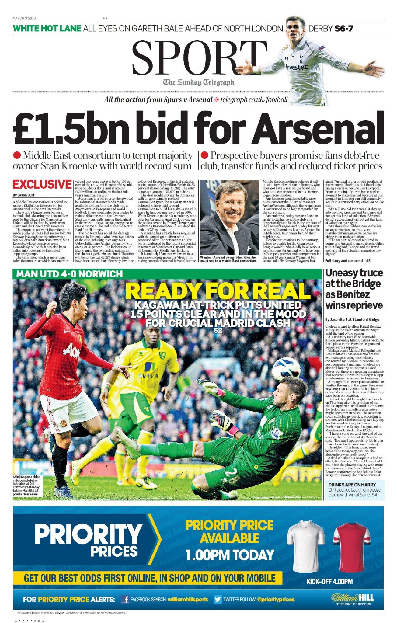 - Эксперты, с которыми я говорил (они были вовлечены во множество подобных переговоров ранее) говорят, что не склонны верить информации, появившейся в прессе. Серьезные инвестиционные группы с Ближнего Востока крайне редко настолько открыто заявляют о своем желании совершить сделку подобного масштаба. Кроме того, в статьях нет каких-либо подробностей, кроме непосредственно суммы возможного тэйковера. Она выглядит значительно завышенной, особенно с учетом возможного непопадания «Арсенала» в следующий розыгрыш Лиги чемпионов.