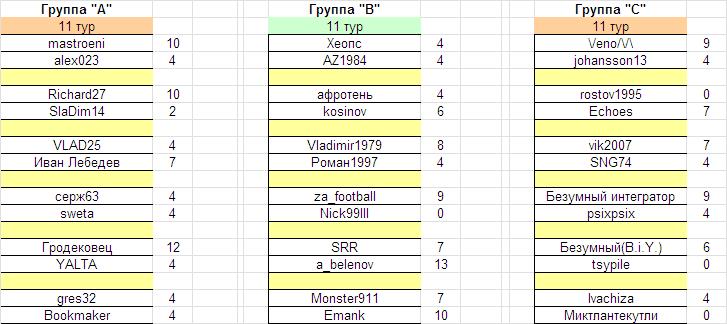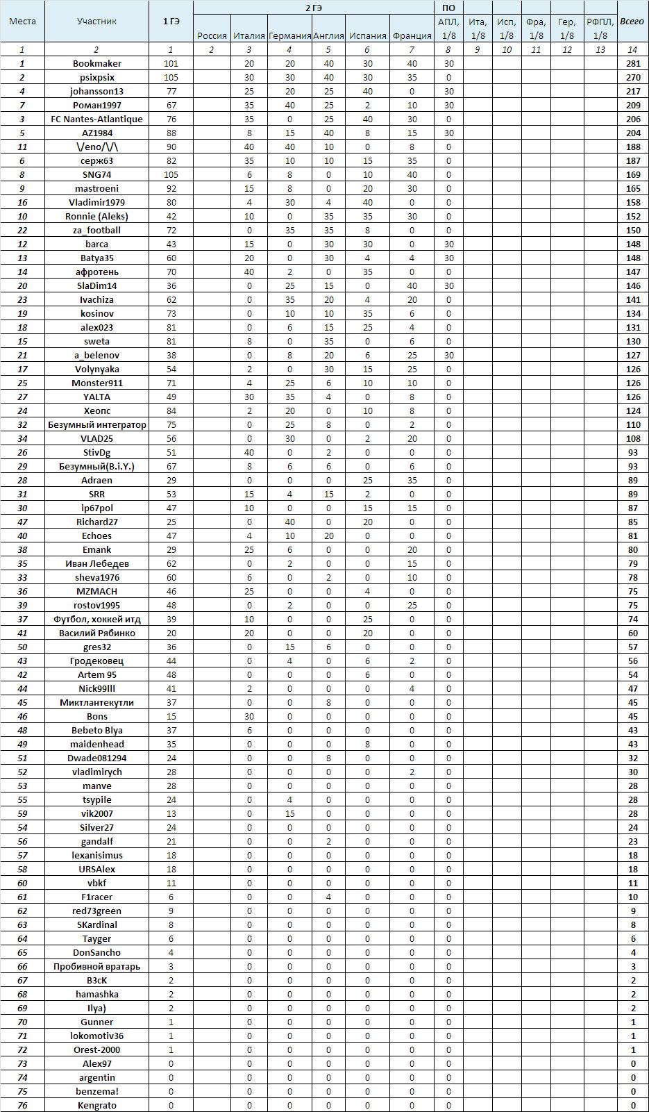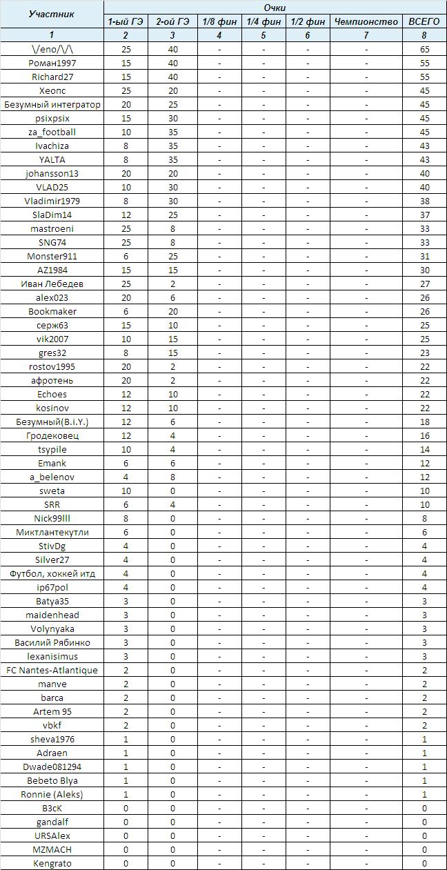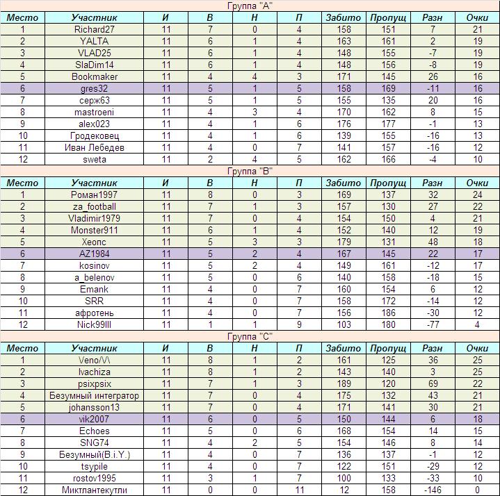 Более темным цветом выделены участники, занявшие 6-е места и претендующие на единственную оставшуюся путевку в 1/8, которую получает (кстати, без использования вышеописанного Принципа при равенстве набранных очков) ... vik2007.