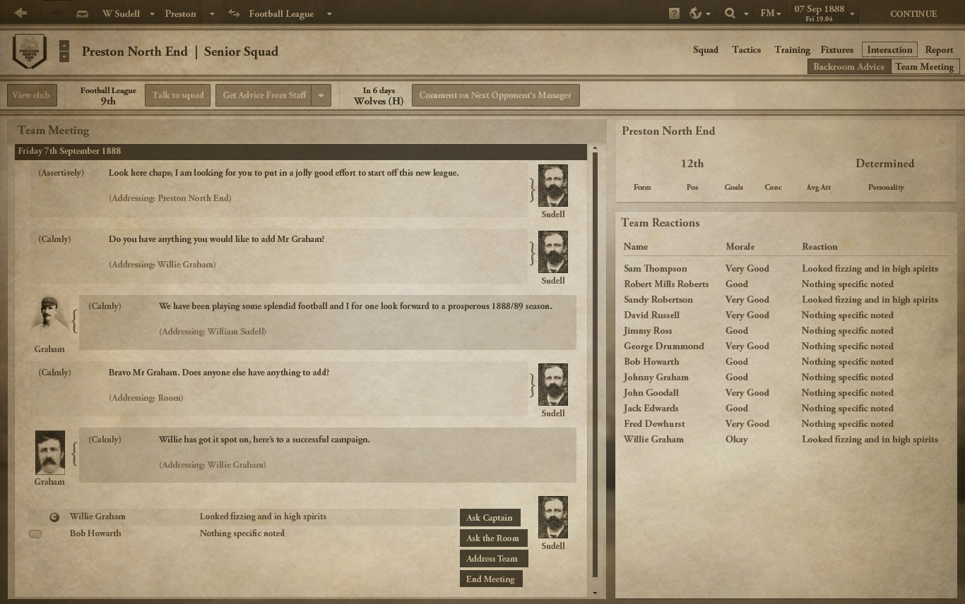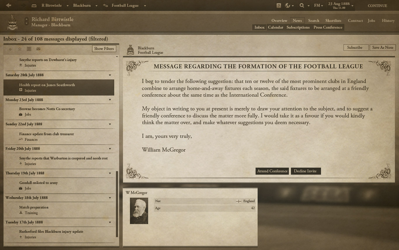 Как известно, первым профессиональным сезоном английской лиги считается 1888/89, создатели Football Manager решили именно его и реализовать в своей игре. Всё очень реалистично: полные составы всех 12 английских клубов того времени, движок матча 19 века, тактики и футбольные правила того времени, оригинальный интерфейс.