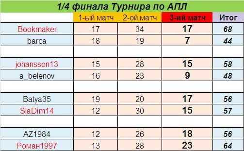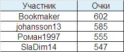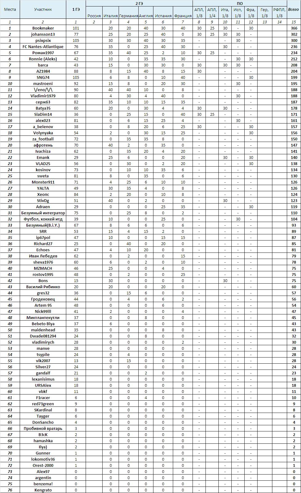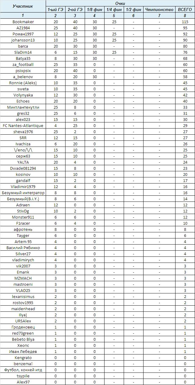 На данный момент с общим тоталом набранных очков в Лиге Прогнозов среди вышедших в полуфинал дело обстоит так: