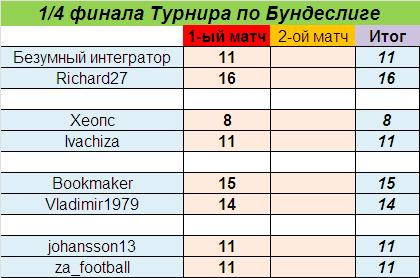 В рамках прошедшего 29-го тура Чемпионата Германии по футболу состоялись 1-е матчи 1/4 финала Турнира по Бундеслиге, которые завершились следующим образом:
