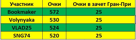 Все вышедшие в полуфинал, получают в общий зачет Гран-При по 25 баллов.