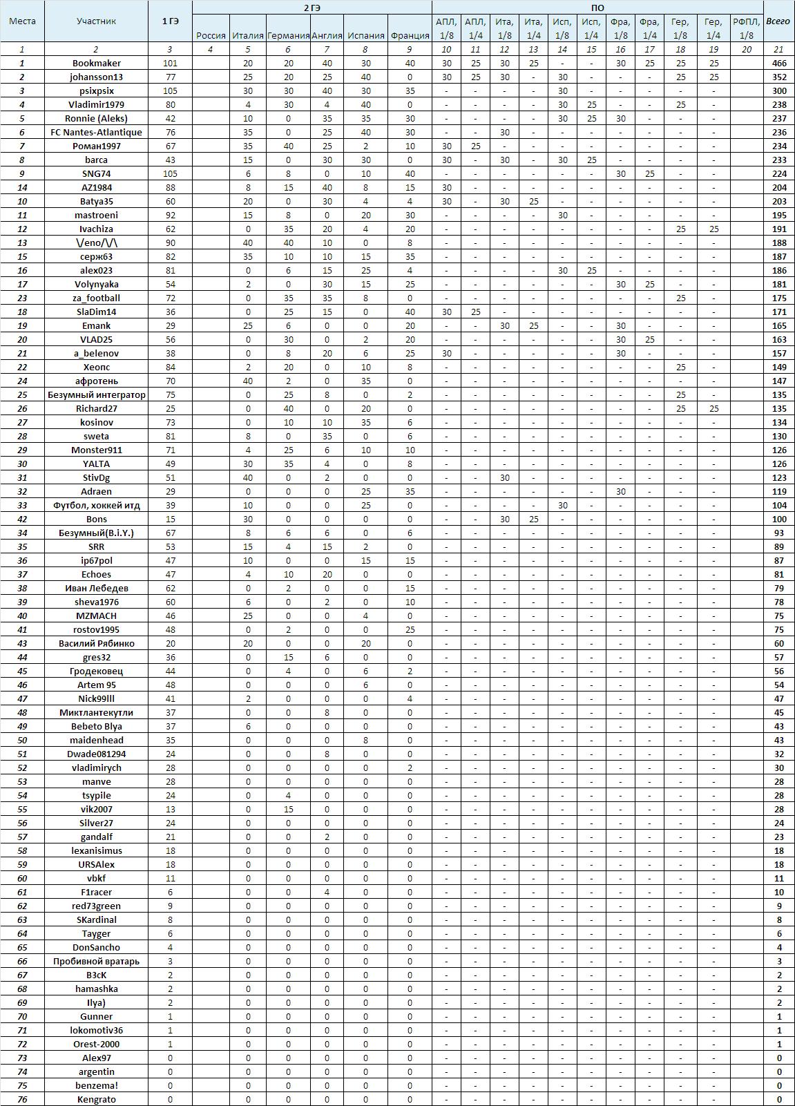 Чтобы составить пары 1/2 финала посмотрим на зачет в Лиге Прогноза, применительно к Лиге 1.
