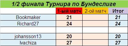 В рамках прошедшего 31-го тура Чемпионата Германии по футболу состоялись 1-е матчи 1/2 финала Турнира по Бундеслиге, которые завершились следующим образом: