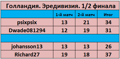 В финале (серия из двух матчей) сыграют psixpsix - Richard27, в матче за третье место встретятся Dwade081294 - johansson13.