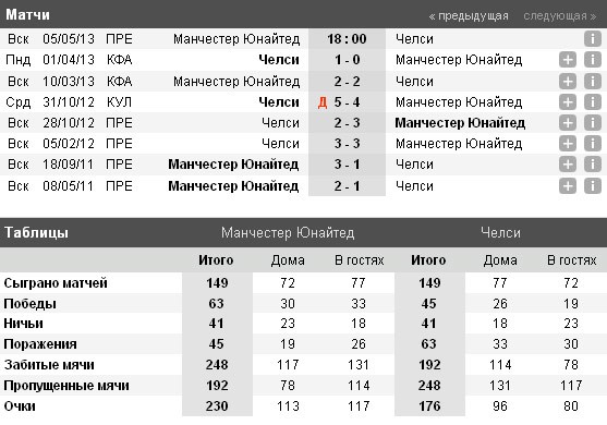 Последний матч, который провели команды, был поединком за Кубок Англии. После ничьи на «Олд Траффорд» (подопечные Сэра Алекса вели 2-0 к перерыву), Демба Ба открыл счёт на «Стемфорд Бридж», и этот гол остался единственным в той встрече.
