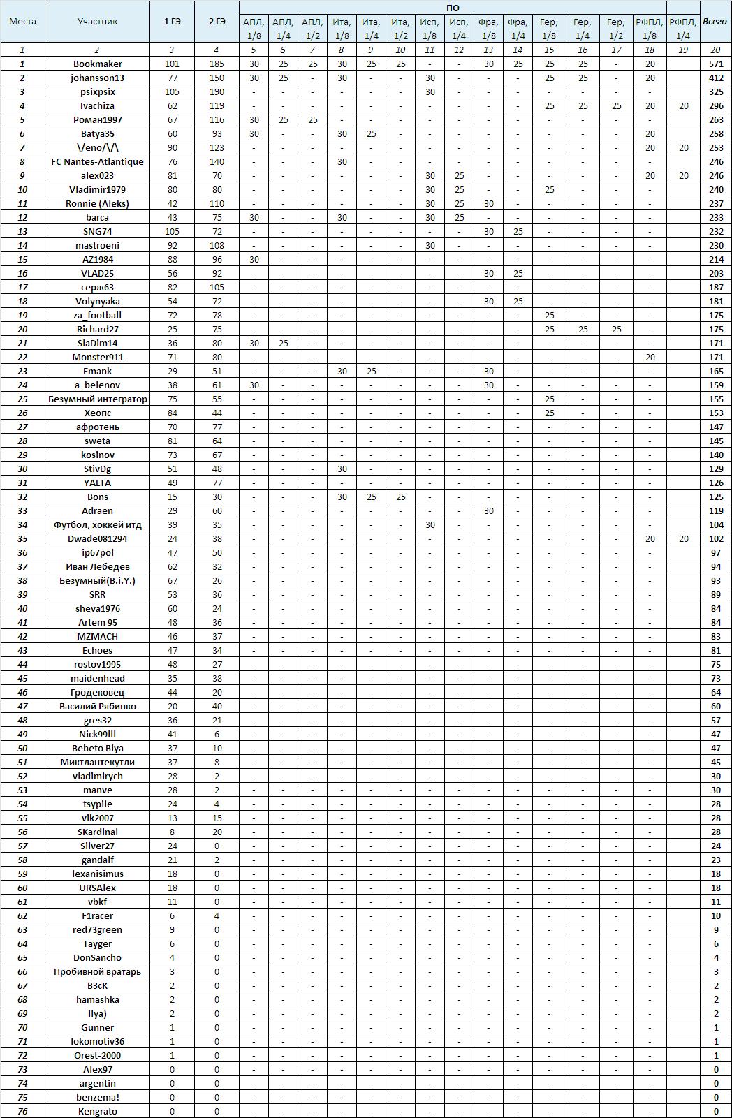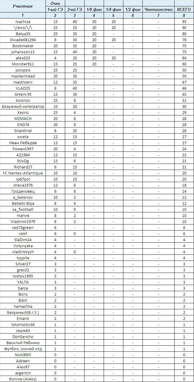 Для того, чтобы определить пары 1/2 финала, традиционно, составим зачет всего набранных очков Лиги прогнозов в рамках нашего Турнира по РФПЛ: