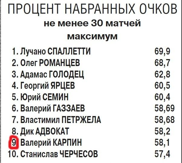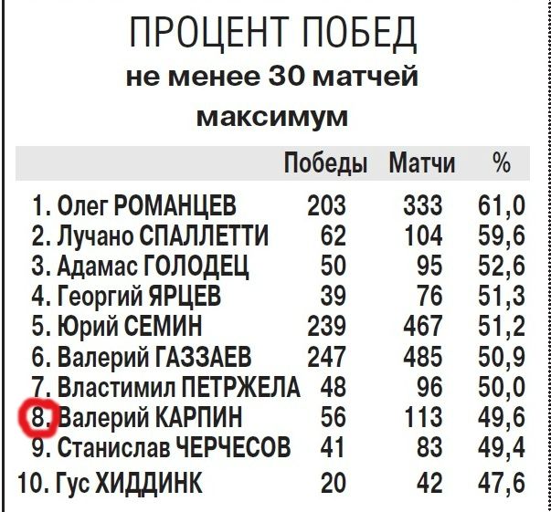 49,6% побед у Карпина – цифра почти философская. Для того, чтобы одержать итоговую победу на такой длинной дистанции, как чемпионат России, согласитесь, этот процент должен быть выше психологической отметки 50. Так, у победителя сезона-2012/13 ЦСКА он – 66,6%, у "Зенита" образца сезона-2011/12 – 54,5%, у той же команды из Санкт-Петербурга годом ранее – 66,6%. В 2001 году "Спартак" под руководством Романцева имел итоговые 56,6% выигранных поединков - после этого красно-белые так высоко в таблице не забирались. Поэтому не случайно, что выше Карпина в этом своеобразном рейтинге сплошь опытные наставники, познавшие вкус золотых медалей премьер-лиги, и лишь два возмутителя спокойствия, в разные годы останавливавшиеся на подступах к высшей ступени пьедестала российского футбола: экс-наставник "Динамо" Адамас Голодец (52,6%) и бывший рулевой "Зенита" Властимил Петржела (50%). Обратим внимание на отсутствие в десятке лучших Дика Адвоката: при опытном голландце "Зенит" был четвертым, первым, пятым и третьим. Красно-белые под руководством Карпина выступают стабильнее и ниже четвертого места по итогам сезона не опускались.