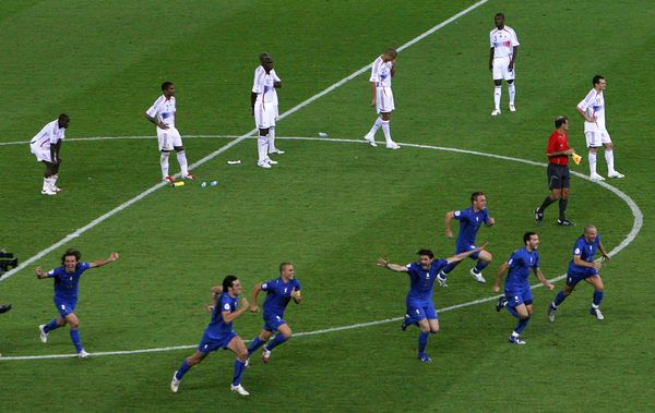 Поскольку ни основное, ни дополнительное время не выявило победителя (счёт остался 1:1), была назначена серия послематчевых пенальти, второй раз за всю историю финалов чемпионата мира по футболу. Итальянцы — Пирло, Матерацци, Де Росси, Дель Пьеро, Гроссо — выполнили 5 результативных ударов. Французы — Вильтор, Трезеге, Абидаль, Саньоль — выполнили 4 удара, из которых лишь 3 оказались результативными (Трезеге попал в перекладину). По итогам серии послематчевых пенальти сборная Италии четвёртый раз за свою историю стала чемпионом мира.