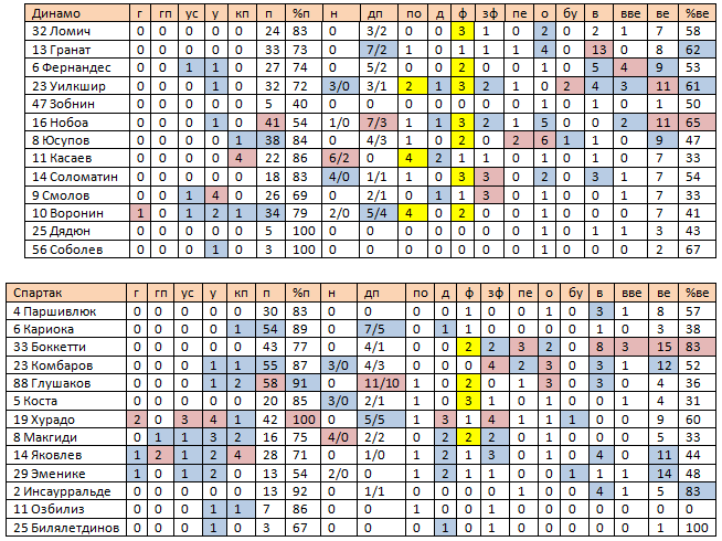 г- гол; гп –голевая передача ;ус-удары в створ; у -удары всего; кп – ключевая передача (передача, после которой партнер по команде наносит удар), п – передачи всего; %п - точность передач; н -кроссы/удачные; дп –длинные передачи / точные; по – потери (обрезы); д - удачный дриблинг; зф –сфолили на нем; ф - фолы; пе – перехваты; о – отборы; бу – блокированные удары; в- выносы мяча из своей штрафной вве – выигранные воздушные единоборства, ве - выигранные всего единоборства, %ве - процент выигранных единоборств.