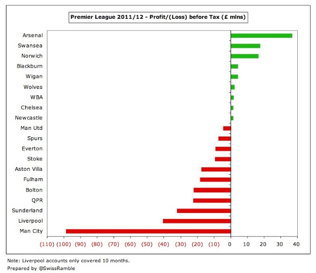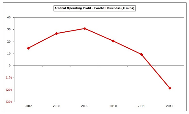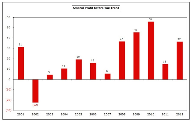 Однако, голые цифры не показывают всей картины, так как большая часть этой прибыли пришла от продажи игроков и торговли недвижимостью. Если исключить эти цифры, «Арсенал» в последние два сезона потерпел убытки: 4 миллиона в сезоне 2010/11 и, на первый взгляд тревожный, 31 млн в 2011/12.