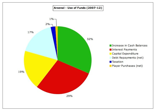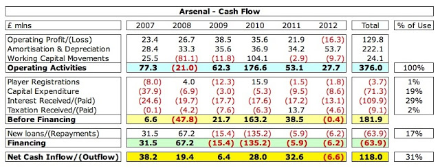 С 2007-ого года в «Арсенале» наблюдался очень здоровый поток наличных в размере 376 млн фунтов. Интересно, однако, как клуб их использовал: 71 миллион фунтов пошел на капитальные расходы, 110 на проценты по кредитам и 64 – на выплату долга. Только 1% всего потока был потрачен на трансферном рынке: хотя «Арсенал» потратил более 100 млн фунтов на покупки игроков, это более чем компенсировалось продажами.